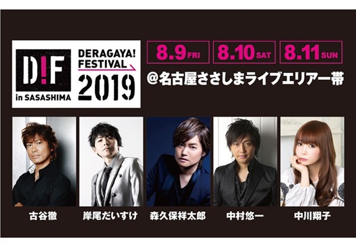 8月9日(金)、10日(土)、11日(日)に名古屋・ささしまライブエリア一帯のライブハウスやホールを会場として、古谷徹、岸尾だいすけ、森久保祥太郎、中村悠一、中川翔子など豪華声優&アーティストが出演する東海エリア最大級の声優イベント“DERAGAYA!FESTIVAL 2019(デラガヤフェスティバル)”が開催。5月16日(木)10時よりイープラスにてチケット第二次先行予約をスタートする。