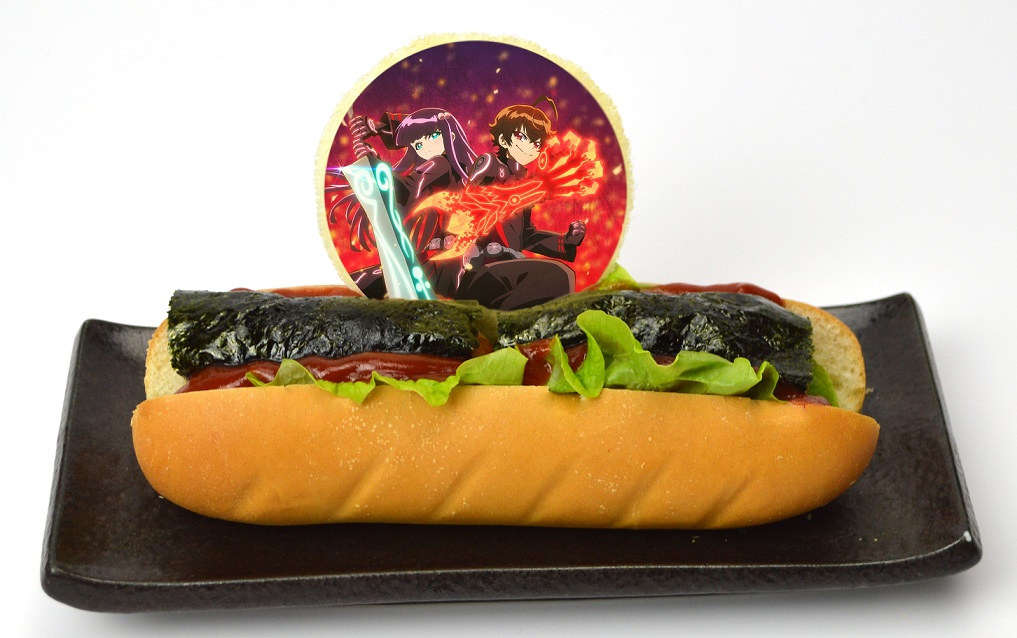 ろくろと紅緒の二人をモチーフにしたホットドッグです。2人のコスチュームをイメージし、ソーセージに焼海苔を巻いてドッグパンに挟み、赤いラインをケチャップで表現しました。