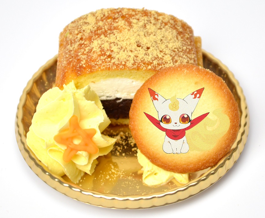 紅緒の使役する式神の“きなこ”から、きなこをかけたどらやきを、和風ケーキに仕上げました。“きなこ”の額にある炎と五芒星をホイップクリームとチョコで表現し、“きなこ”をプリントしたラングドシャを添えました。