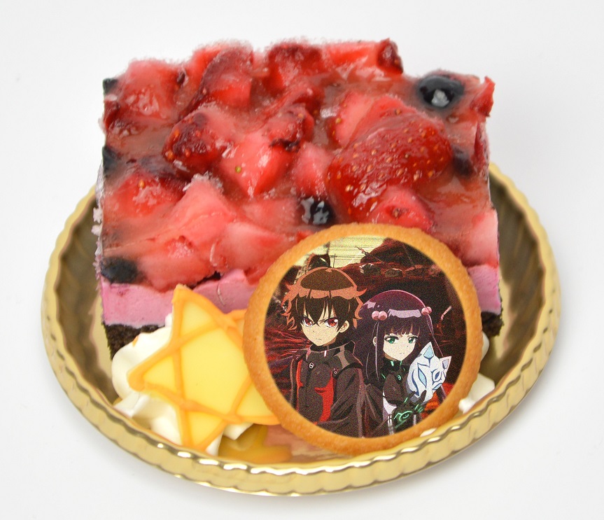 ろくろと紅緒をブルーベ リーとストロベリーに見立てたダブルベリーケーキです。チョコで作った五芒星と、ろくろと紅緒をプリントしたラングドシャ を添えました。