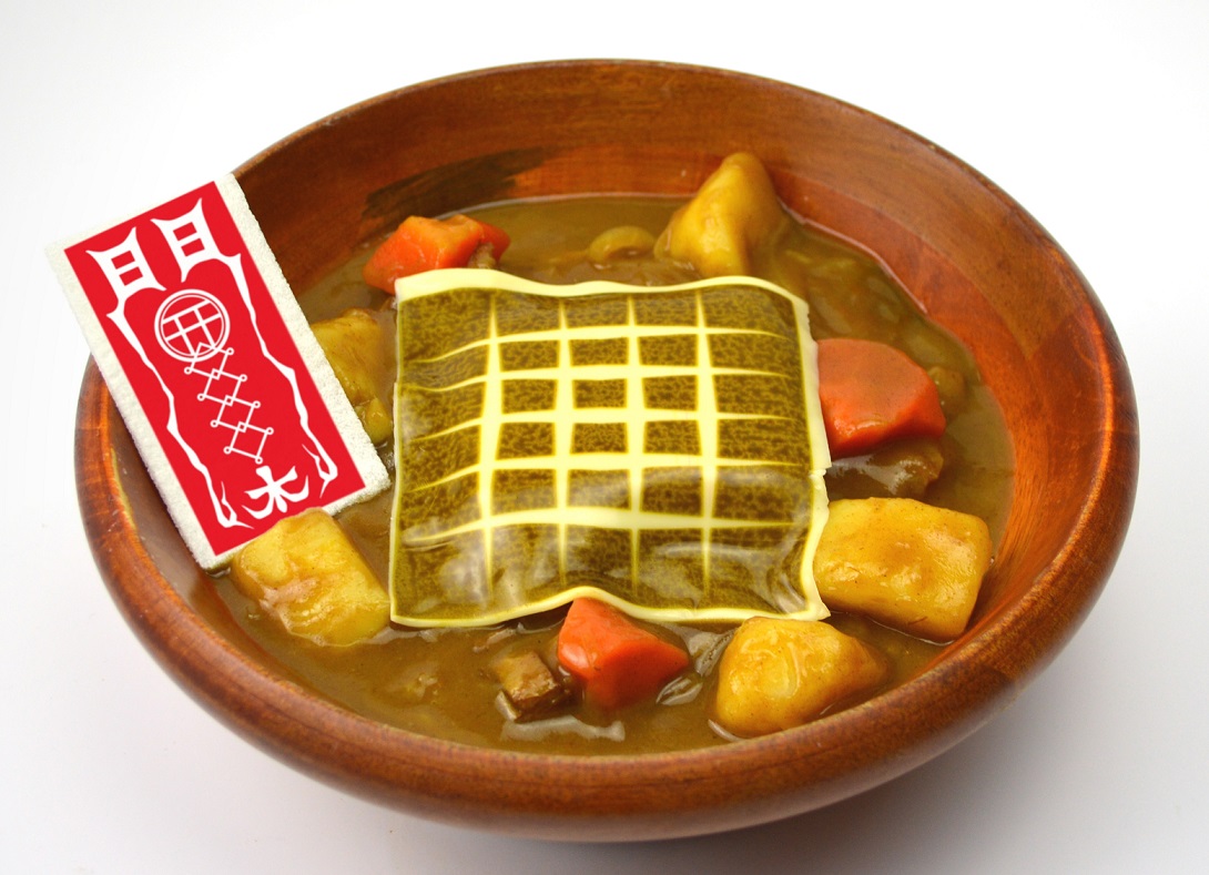 禍野と呼ばれる異世界の住人「ケガレ」をイメージしたカレーです。スタンダードなカレーの上に、胸や腹にみられる九字紋をプリントしたチーズとお札をプリントした最中をのせました。