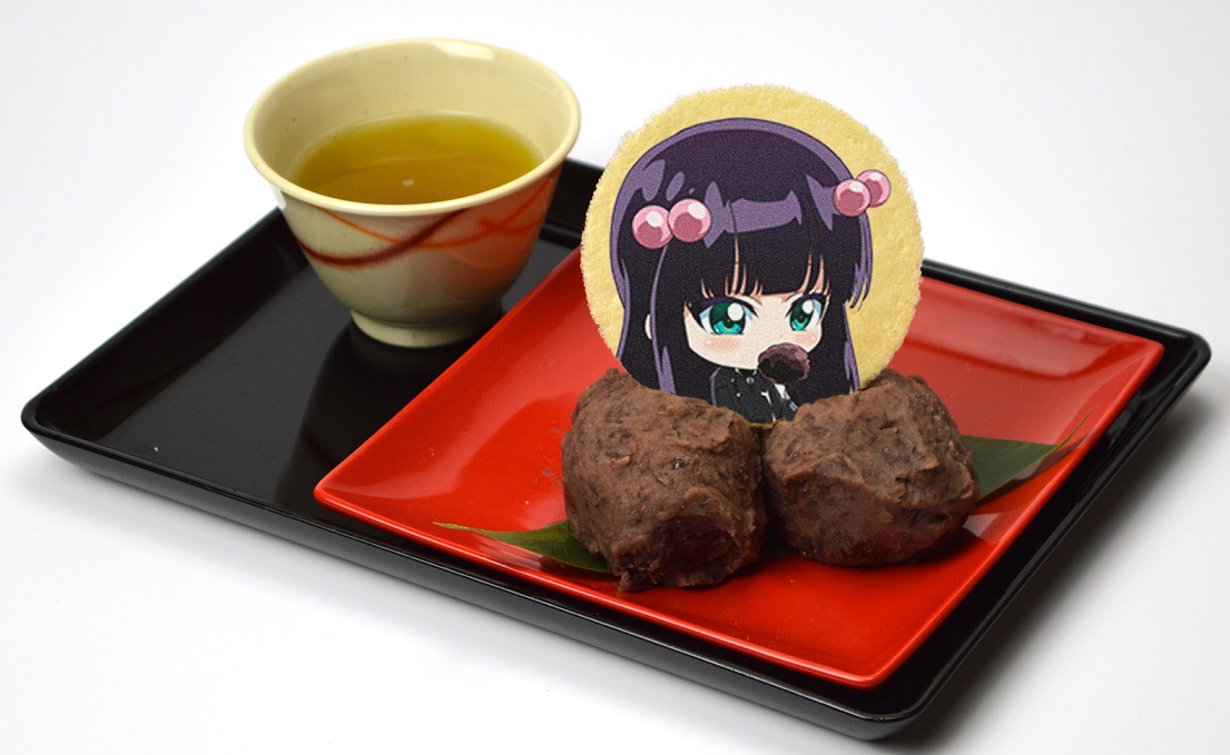 紅緒の好きなおはぎとお茶のセットです。紅緒のプリントせんべいを添えています。