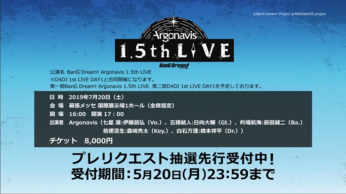 第一部BanG Dream! Argonavis 1.5th LIVE、第二部D4DJ 1st LIVE DAY1の二部構成を予定している。