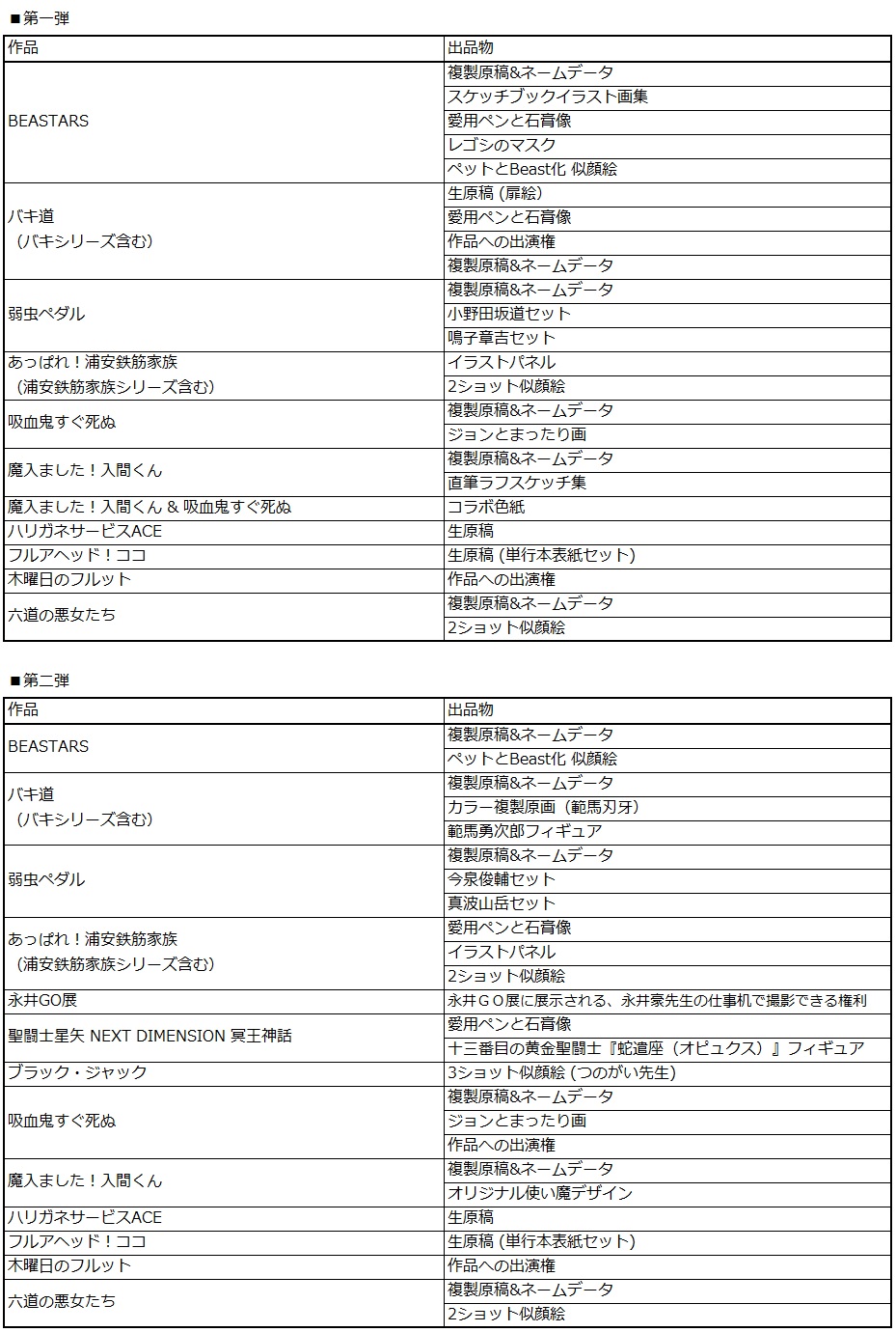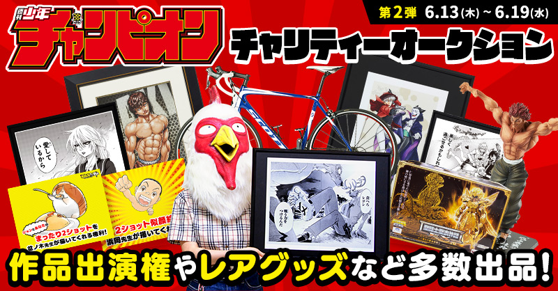 チャリティーオークションは、2019年6月6日(木)~6月12日(水)と、2019年6月13日(木)~6月19日(水)の2回に分けて実施。オークションの売上は、未来を担う子どもたちのために、週刊少年チャンピオンの名作漫画書籍とともに、一部を除いて『赤い羽根の共同募金』を通じて、『放課後児童クラブ』に寄付される。