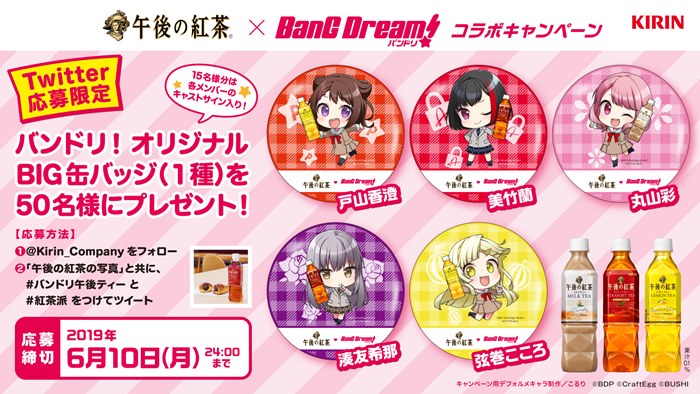 『キリン 午後の紅茶』×『BanG Dream!』がコラボした“オリジナルBIG缶バッジプレゼントキャンペーン”が、2019年6月3日(月)より開催される。