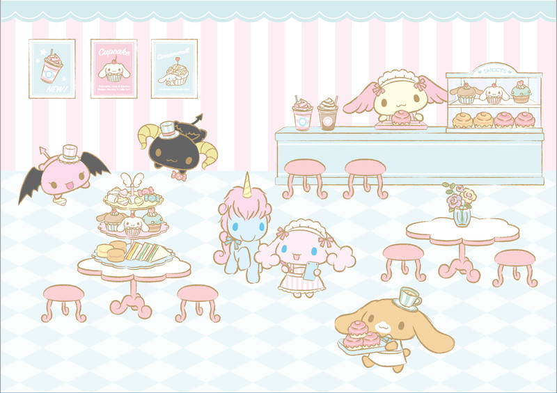 今回のリニューアルテーマは“シナモロールと仲間がお迎えするカフェ”。シナモンフレンズの他に、カプチーノの双子の弟ココとナッツ、シナモエンジェルスのアズキ、ルロロマニックのベリー、チェリーも内装デザインやメニューに登場する。