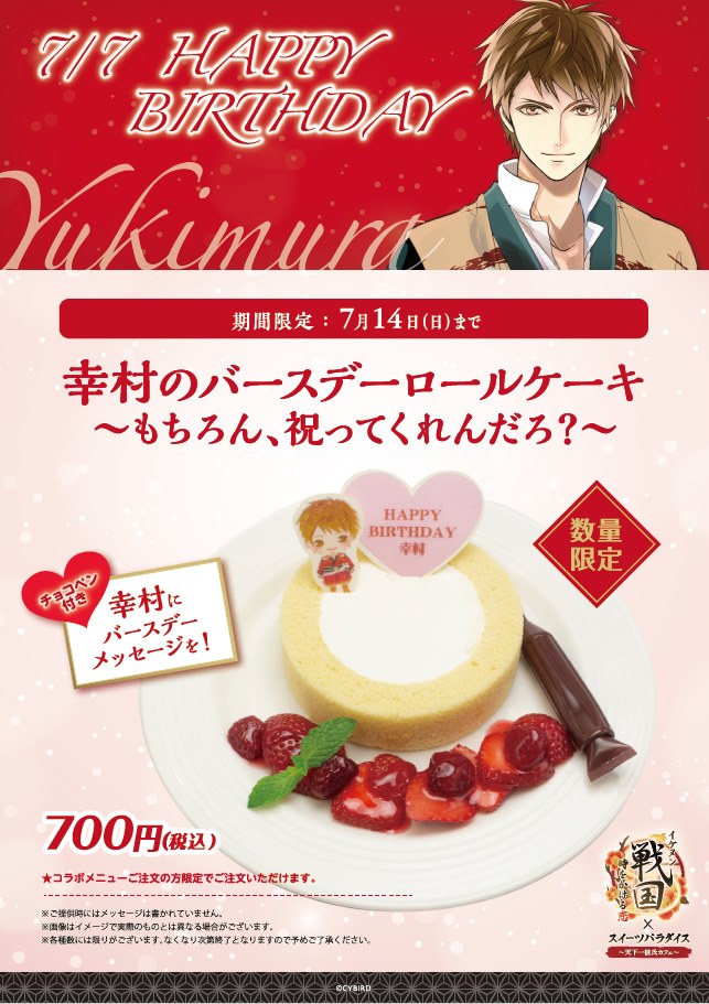 またコラボ期間中の7月7日(日)に誕生日を迎える、イケメン戦国の人気武将“真田幸村”のバースデーロールケーキが期間限定で登場。