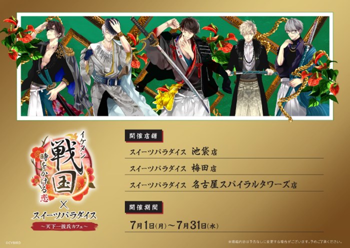 “イケメン戦国の彼こそが天下一”だと日本全土にアピールするため始まった“天下一彼氏キャンペーン”の一環として、7月1日(月)~7月31日(水)の一か月間、東京、大阪、名古屋のスイーツパラダイスに、イケメン戦国の武将たちが“出陣”。
