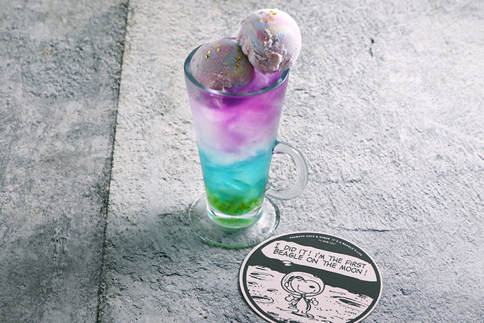 人気メニューのレモネードに、ブルーキュラソーシロップとパープルのマロウブルーティーを加えて美しいグラデーションに。月へ向かうスヌーピーが見たかもしれない!?、宇宙に輝く銀河をイメージし。イートインメニューには、すっきりソーダフレーバーのマーブルアイスをオン。さらに星をちりばめて、写真映え間違いなし!限定オリジナルコースターも付属する。