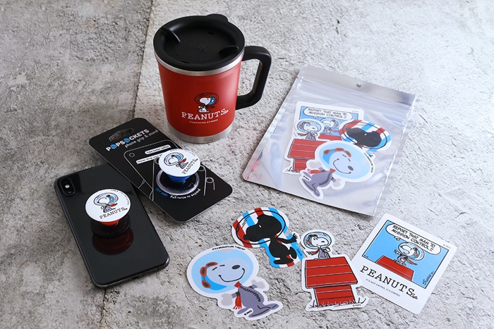毎回、完売必至の携帯アクセサリー、ポップソケッツ・グリップに”アストロノーツスヌーピー”のデザインが新登場!これまでのシリーズはモノトーンだったが、今回初めてアートにブルーとレッドをアクセントカラーとして使用。グリップ部分は中目黒・横浜・神戸の店頭ではレッド、オンラインショップではブルーと2色を用意。各色数量限定なのでお見逃しなく!