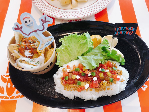 大豆ミートを使用したタコライスプレート。タコスのカップに埋もれたフォーキーもなんだか楽しそう!