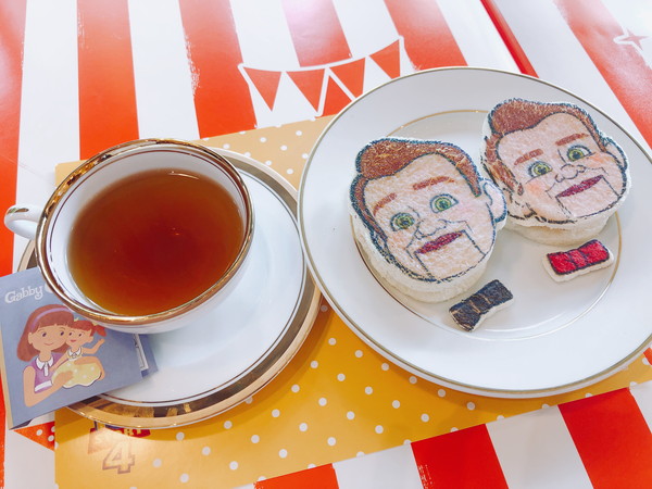 顔を型どったツナサンドとフルーツ入りヨーグルトサンド。映画に登場する絵本のデザインをあしらったアールグレイティバッグ付き(ノンカフェイン)。