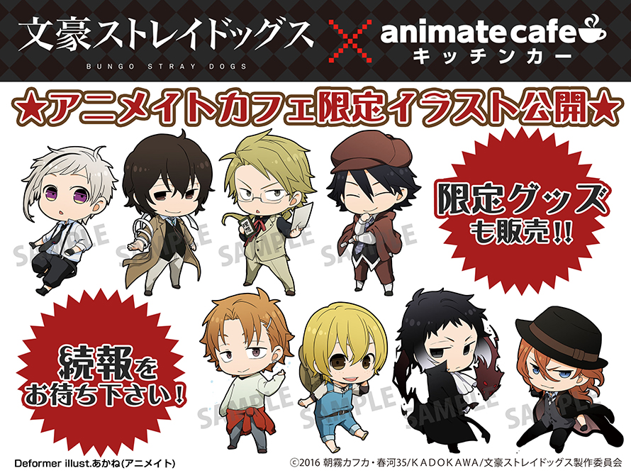アニメ『文豪ストレイドッグス』がアニメイトキッチンカーとコラボすることが決定した。キッチンカーでは作品をイメージしたコラボドリンクを販売する。限定グッズは、アニメイトカフェ描き起こしミニキャライラストを使用する。