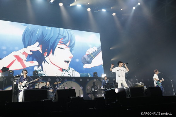 ここで一旦メンバーがステージからはけると、スクリーンに「ゴールライン」のアニメーションMVが流れ、大きな歓声が起こりました。こちらのMVはこの日のライブが初公開。現在はYouTubeのARGONAVIS ch.でも公開されているので、ぜひチェックしてみてください。もちろん次の曲は「ゴールライン」。メンバーの背後のスクリーンではMVが流れ、アニメの5人と実際の5人がリンクするという演出となっていました。特にサビを歌い上げる蓮と伊藤さんの姿がシンクロしていて、見ている人の胸を熱くさせました。