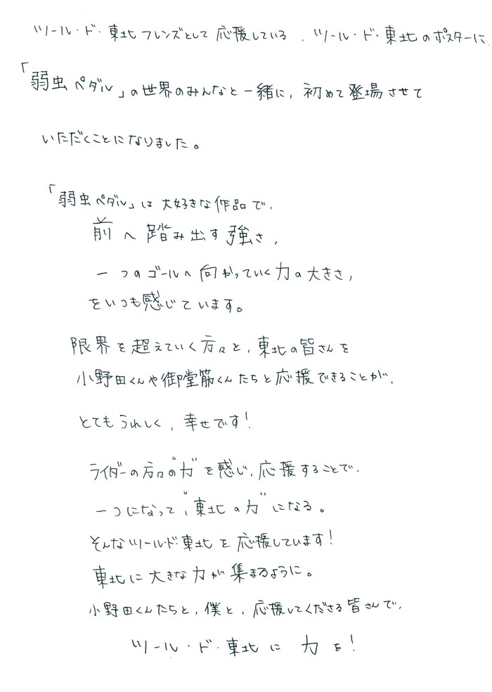 『弱虫ペダル』は大好きな作品で、前へ踏み出す強さ、一つのゴールへ向かっていく力の大きさ、をいつも感じています。限界を超えていく方々と、東北の皆さんを小野田くんや御堂筋くんたちと応援できることが、とてもうれしく、幸せです!