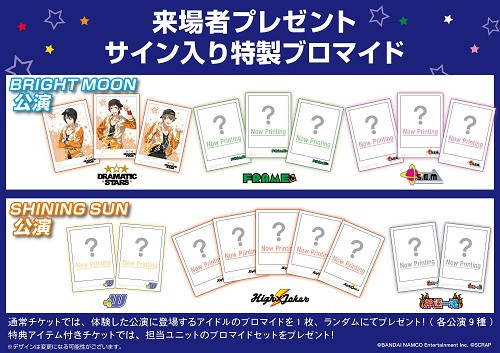 通常チケットでは、体験した公演に登場するアイドルのブロマイドを1枚、ランダムにてプレゼント!(各公演9種) 特典アイテム付きチケットでは、担当ユニットのブロマイドセットをプレゼント!