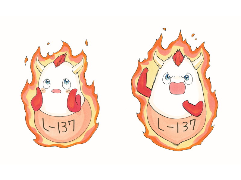 背後の炎は、L-137製造過程における加熱処理が表現されている。この加熱処理によって消化液の影響を受けず、小腸で免疫細胞に出会うまで、免疫力を高める力を安定化することができる。