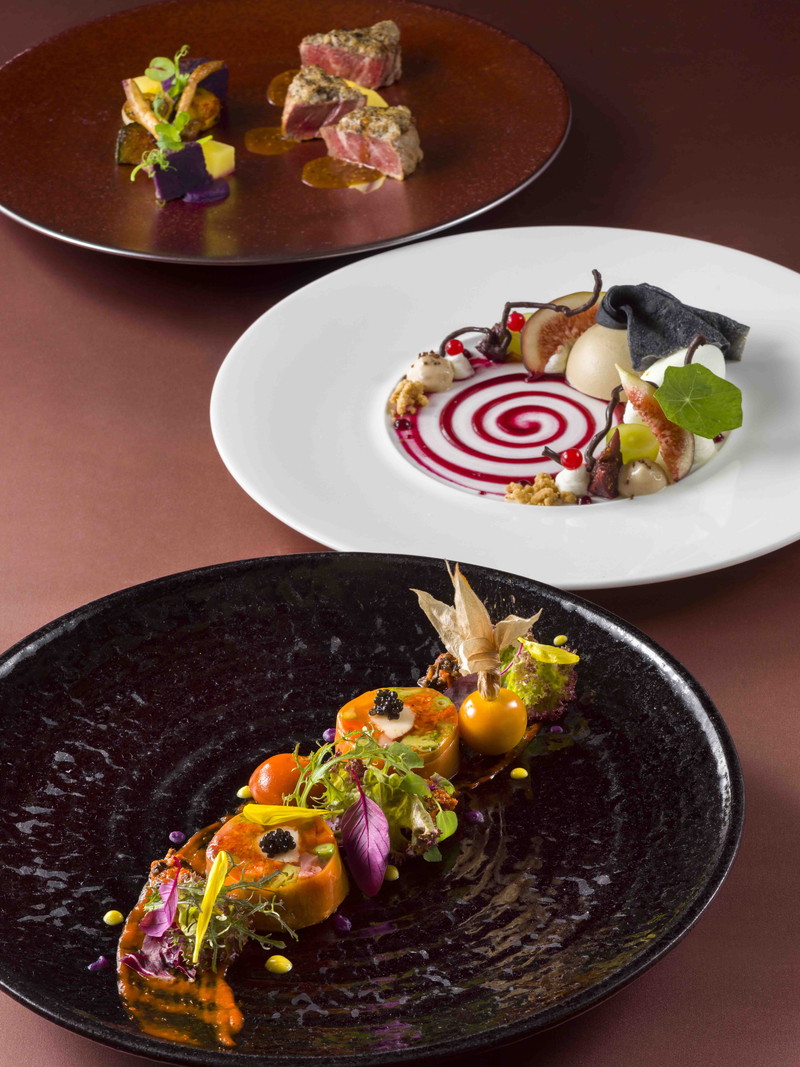 色鮮やかなオマール海老と野菜のテリーヌ(写真手前)や、茸を絡めたビーフテンダーロインのグリル(写真奥)、鮮やかなカシスソースが印象的なデザート (写真中央)を含む、色彩が美しい全6品のディナーコース。