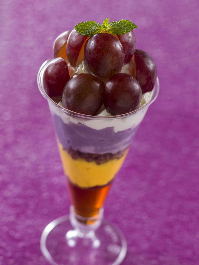 パンプキンと紫芋の2層のジェラートでハロウィーンカラーをイメージしました。コクのあるジェラートと相性の良いフレッシュな巨峰で、味の バランスをとっています。また、さわやかな紅茶のゼリーや、サクサクとした チョコクリスピーで、様々な食感もお楽しみいただけるよう仕上げました。