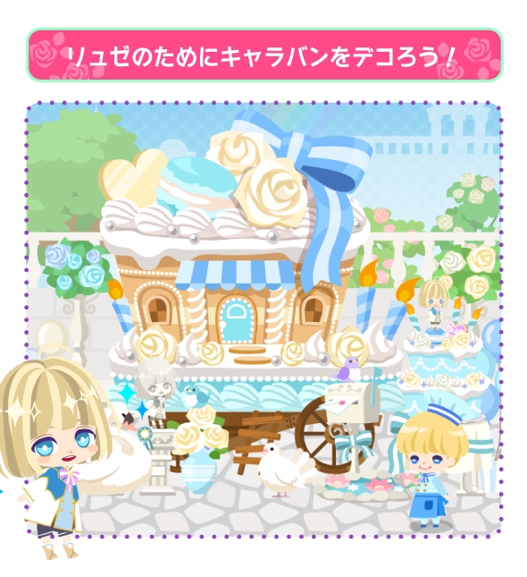 イベント期間中、ゲーム内コンテンツ『キャラバン』に指定のテナントを設置すると、イベント客“水色のパティシエ”が来店します。水色のパティシエからランダムで手に入る“白薔薇”を集めることで、全6話の限定ストーリーやキャラバンに設置できる限定デコを獲得できます。