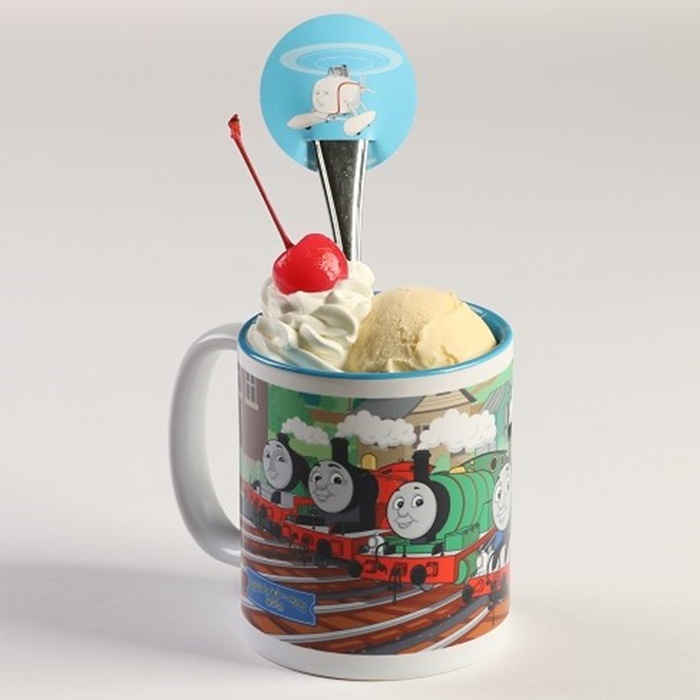 空のうえからトーマスやなかまたちをパトロールしているハロルド。マグカップはお持ち帰りいただけます。