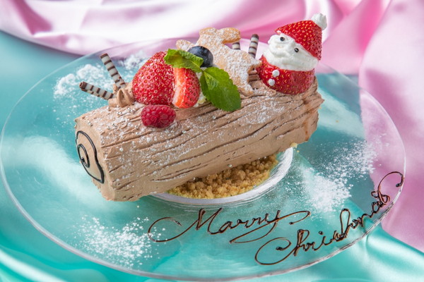 クリスマスケーキの代表格とも言えるのが、西洋でも伝統的なブッシュ・ド・ノエル。森の丸太を表現したロールケーキには、チョコクリームが綺麗な木目を描きながらたっぷりあしらわれている。幻想の国では、小さないちごのサンタさんが乗ってゲストを歓迎。ぜひ一緒に記念撮影を。
