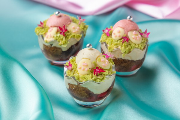 慌てん坊の白うさぎは、お茶会に間に合わないと急ぐがあまり、お花畑に突進してしまった!? キュートなまん丸のお尻は口当たりの柔らかなムース、そしてうさぎが突っ込んだお花畑は、コーヒーの芳醇な薫り漂うティラミスで仕立てられている。可愛いだけじゃない実力派デザートだ。