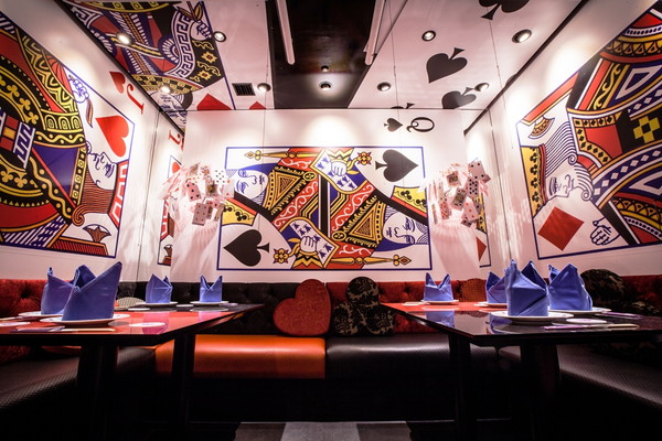 トランプ柄のスクリーンカーテンが勝手に映える背景を演出してくれる半個室。ワイワイ楽しむ女子会シーンに大活躍!