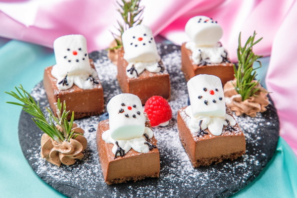 冬の合間の陽気に誘われて、思わず日向ぼっこしてしまった雪だるまは案の定…! うっかり者の雪だるまの正体は、ふわふわのマシュマロ。陽の当たる地面を表現した、滑らかなレアチョコケーキと合わせると、とろける甘さはもちろん、不思議な食感の妙も楽しめる。