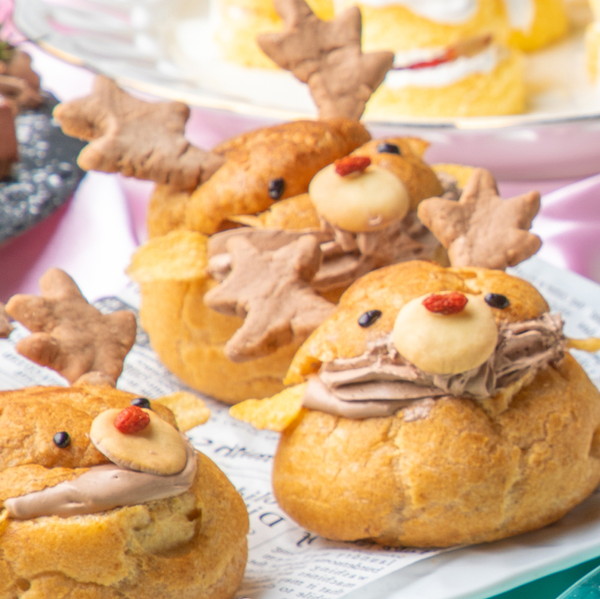 定番人気のカップデザートには、かわいらしいクリスマスツリーが仲間入り。また、ハロウィンでかぼちゃ頭のジャック・オー・ランタンとして注目を集めた大ぶりのシュークリームは、愛嬌たっぷりの表情をしたトナカイへと変身した。そのほか、秋~冬の食材をたっぷり使った季節のパスタなど軽食メニューも一層充実し、訪れるゲストのお腹と心を満たすラインナップとなっている。