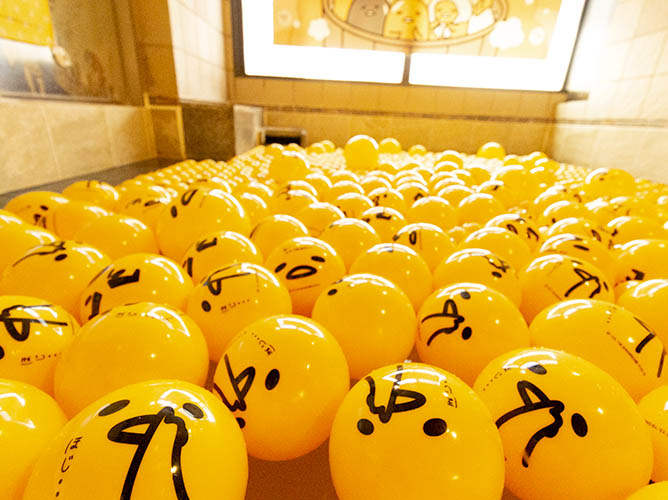 ぐでたまをイメージしたお風呂が登場。合計10,000個のぐでたまのボールがお出迎え。共同開発したオリジナル入浴剤はたまごを使ったお菓子をイメージ。またぐでたまの湯開催期間のみ、浴室の風呂桶がぐでたまデザインとなる。