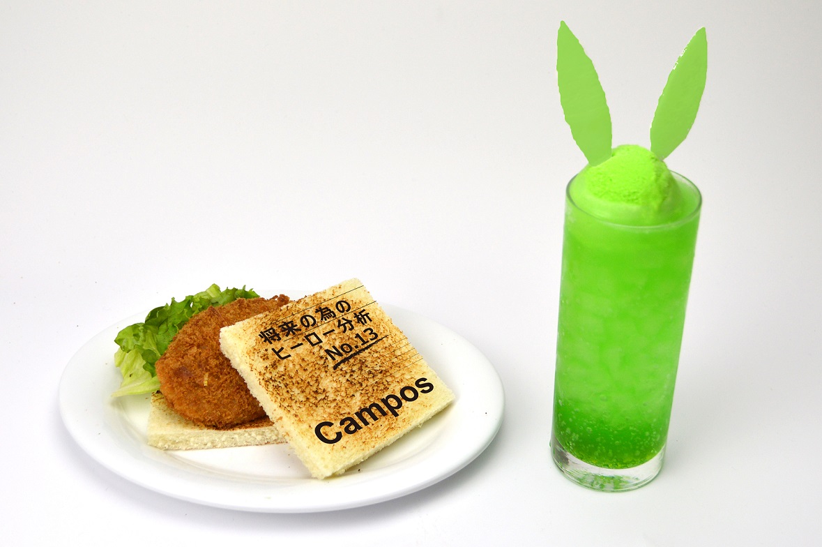 主人公の緑谷出久(デク)をモチーフにしたメニューです。デクのヒーローコスチュームをイメージしたメロンソーダドリンクと、爆豪に焦がされた「将来の為のヒーロー分析,No.13」ノートを、デクの好物カツ丼をアレンジしたカツサンドに仕上げました。