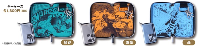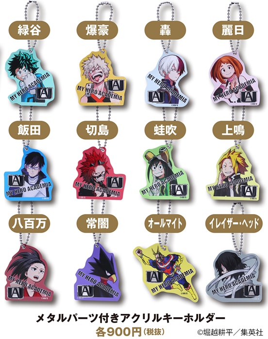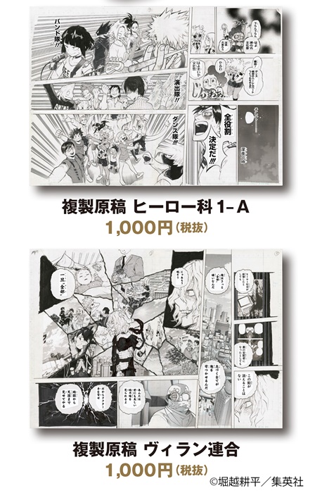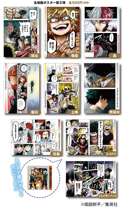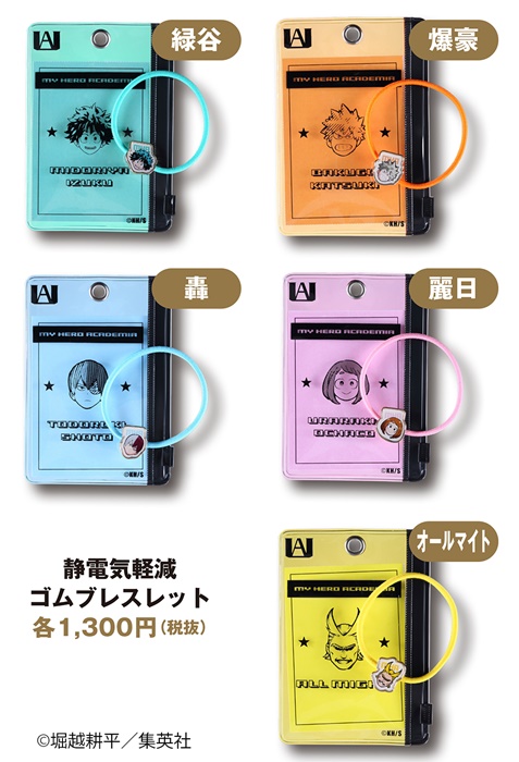 そのほかにも、パチッとくる静電気を軽減してくれる“静電気軽減ゴムブレスレット”(全5種)や内側の原作絵柄にまでこだわったカッコイイ“キーケース”(全3種)、雄英高校の校章のデザインのメタルパーツが付いた“メタルパーツ付きアクリルキーホルダー”(全12種)、原作商品ならではのアイテム“複製原稿”(全2種)、あの名場面をカラーで自宅へ持ち帰る事ができる“名場面ポスター”第2弾(全9種・ランダム仕様)が登場。