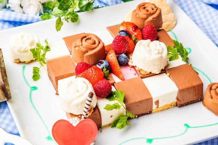 『不思議の国のアリス』の続編『鏡の国のアリス』でも描かれているチェスゲームの場面。そのチェス盤をレアチーズケーキと同じくレアのチョコレートケーキで再現しました。いちごを始めラズベリーやブルーベリー、ムースのバラもあしらわれ、女王様ならずとも見とれてしまいそうな美しさです。