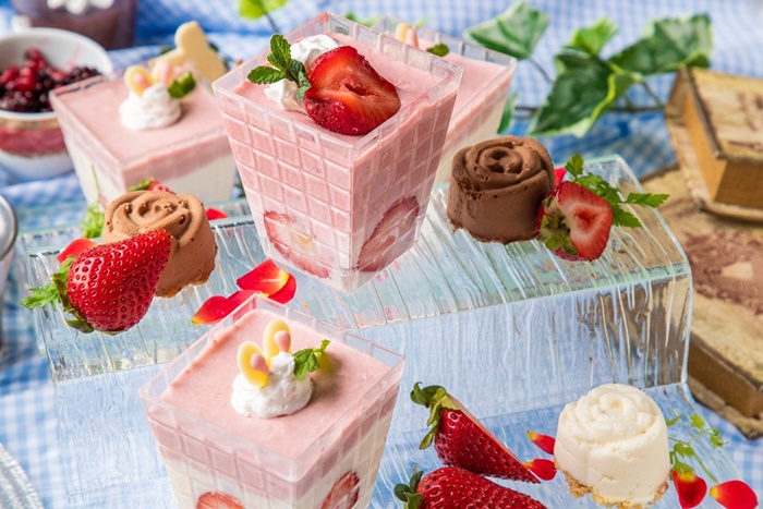 女王様がこよなく愛するバラが咲き誇るお城の庭園を表現したミニデザートエリアも要チェック。ココナッツやチョコレートのムースでできたバラや、いちごとヨーグルト各々の爽やかな風味が引き立つグラスデザートなどが並びます。よーく見ると、かくれんぼして遊んでいる白うさぎさんの姿も!?