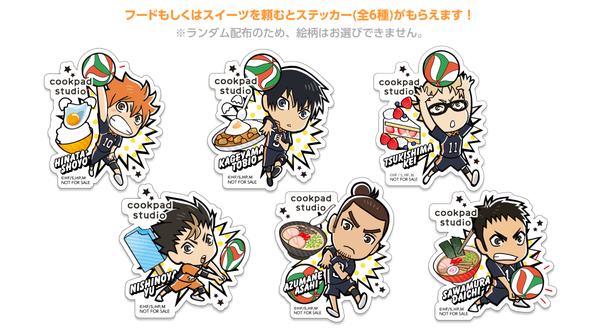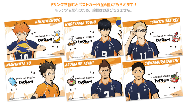 この度、CookpadTVがTVアニメ『ハイキュー!!』の世界観を食の視点から考察し、各キャラクターの大好物メニューをアレンジした限定メニューを開発。全てのフード・ドリンクメニューに、 オリジナルノベルティがセットになっている。また、コラボ期間中に「cookpad studio 烏野祭」限定グッズも販売される。