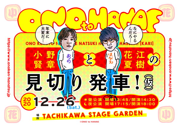 12月26日(土)立川市・TACHIKAWA STAGE GARDENにて、『小野賢章と花江夏樹の見切り発車!(仮)』が開催されることがわかった。