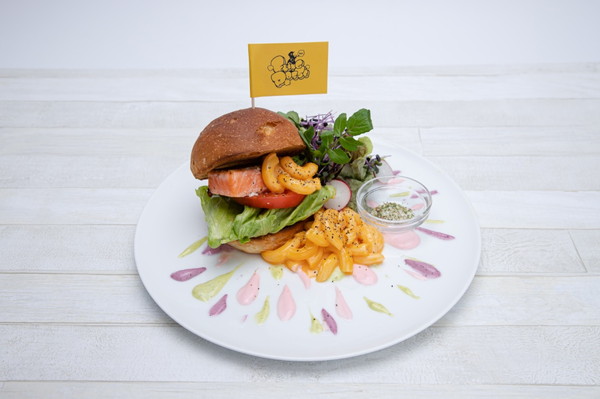サーモンソテーやマカロニチェダーチーズ トマトを挟んだバーガー。3色のソースやオリジナルのスパイスを付けて味の変化を楽しんで。ディビジョンロゴのピック付き。