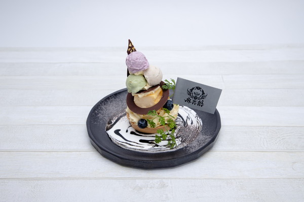 お好み焼きをイメージしたパンケーキに、 たこ焼き風シュークリームを乗せた一品。パンケーキの間にはプリンが挟まれている。ディビジョンロゴのモナカ付き。