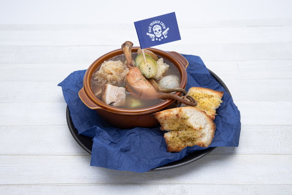 豚肉やじゃがいも、ぜんまいなどの具材がたっぷり入った、骨付きソーセージが印象的なポトフ。ガーリックトーストと一緒に召し上がれ。ディビジョンロゴのピック付き。