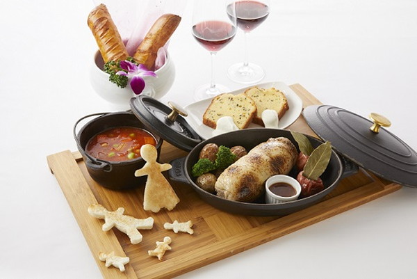 『進撃の巨人』の世界観をイメージしたお食事を、コラボルームに滞在の方限定で食べることができる。「サシャ」がお肉にかぶりつくシーンをイメージした肉料理や、「リヴァイ」の好物の紅茶のパウンドケーキなど、『進撃の巨人』にちなんだメニューが提供される。