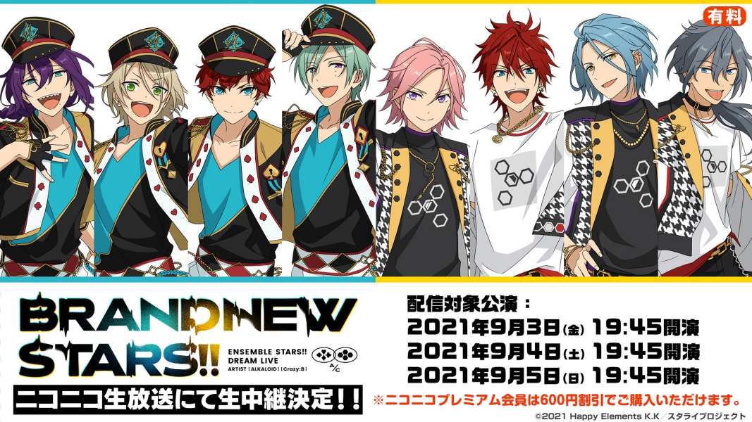2021年9月3日(金)、4日(土)、5日(日)に豊洲PIT(東京都)で開催される「あんさんぶるスターズ!!DREAM LIVE -BRAND NEW STARS!!-」各日第四部の模様を、ニコニコ生放送にてライブ配信が決定&本公演の視聴チケットの販売を開始致しました。