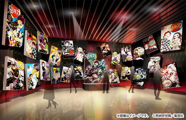 炭治郎と襧豆子の等身大フィギュアが、コミックスの表紙たちとともにお出迎え!