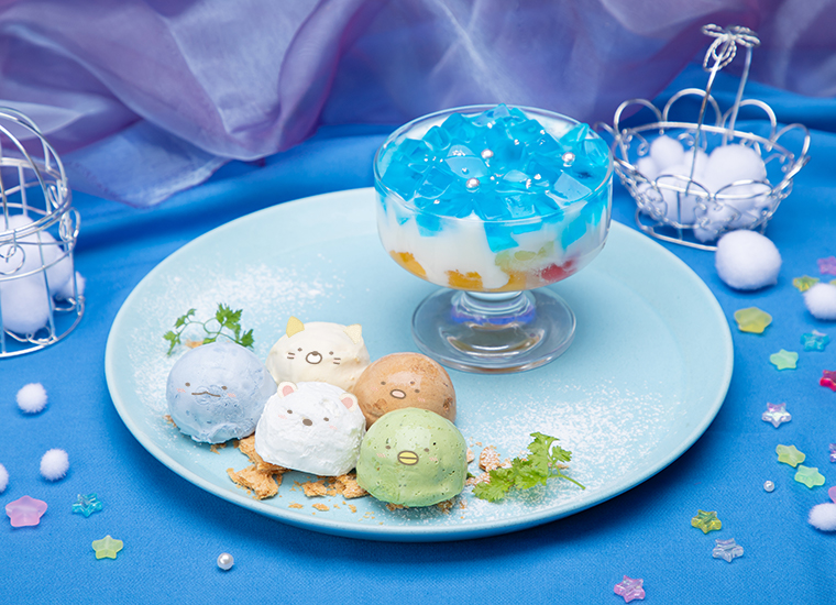 青いお月様がキラキラきれいなフルーツポンチ。しろくま、ぺんぎん?、とんかつ、ねこ、とかげよりお好きなすみっコのミニアイスをひとつ選んでください。+220円(税込)でミニアイスをひとつ追加することができます(追加は最大4個まで)。