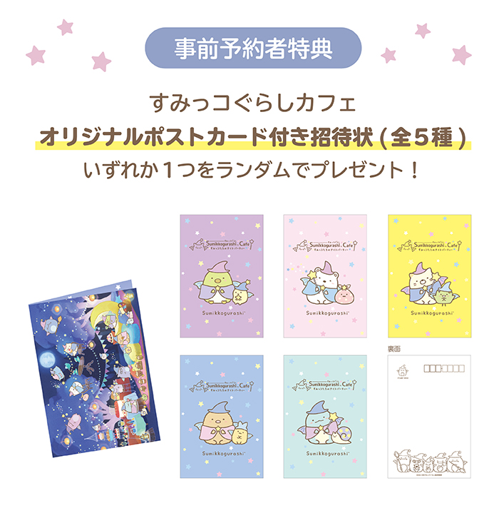 事前予約(税込715円/1名)をご利用いただき、メニューをご注文いただいた方に「オリジナルポストカード付き招待状(全5種)」から1枚をランダムでプレゼント。