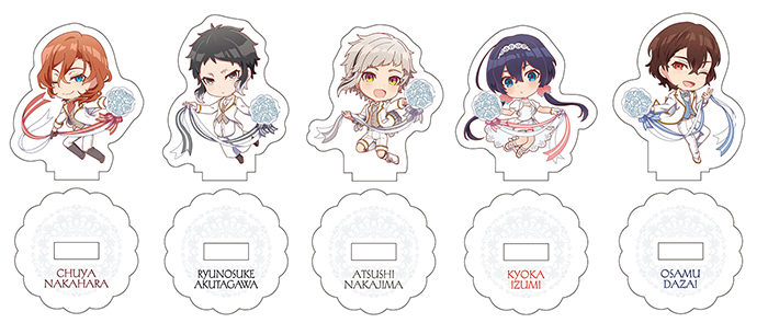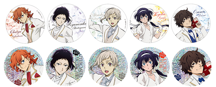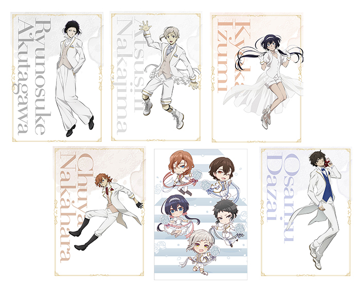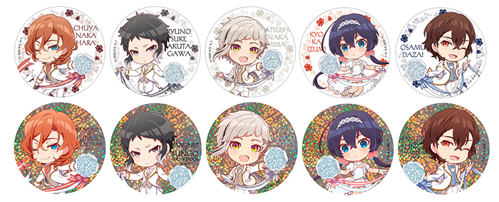 お祝い衣装に身を包んだミニキャラver.の敦、芥川、鏡花、太宰、中也のイラストを使用。一部ホログラム仕様。
