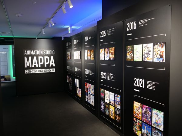 エントランスエリアでは2012年から2021年まで公開した作品を年代順に展示しているほか、MAPPAからファンに向けたメッセージを展示しています。