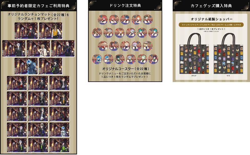 また、本をイメージしたスペシャルボックスに入ったフードメニューや「ナイトレイブンカレッジ」の7つの寮をそれぞれイメージしたドリンクの他、昨年に引き続き、上倉エクさんがイラストを担当した「ミニキャラシリーズ」と、「総柄シリーズ」のデザインで、ファッション雑貨やステーショナリーなどのカフェオリジナルグッズ、オリジナルノベルティ等を展開いたします。
