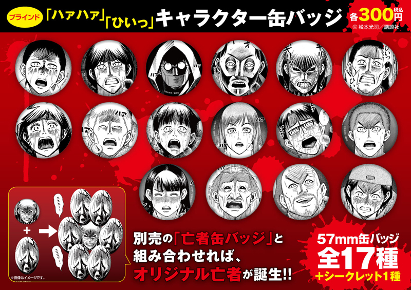 「ハァ ハァ」、「ひいっ」キャラクター缶バッジ。別売りの「亡者 缶バッジ」と組み合わせてオリジナル亡者を作ろう!