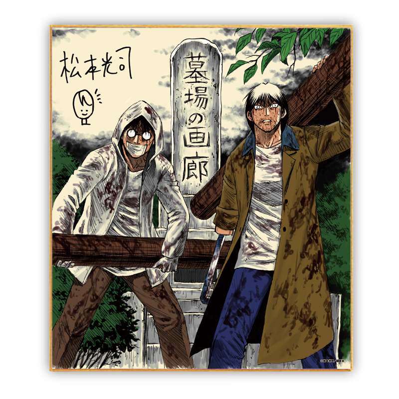 中野ブロードウェイにひっそりと佇む「あの世とこの世を結ぶ特殊画廊【墓場の画廊】」にて、兄貴と明が再び出会う……!! 松本先生による完全描き下ろしのイラストが複製色紙とTシャツになって登場!